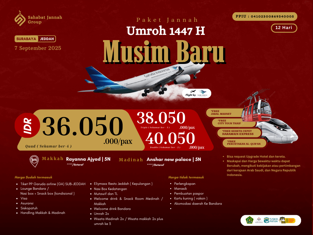 - Maskapai & Harga Sewaktu - waktu dapat berubah, mengikuti kebijakan atau pertimbangan dari Kerajaan Arab Saudi, dan Negara Republik Indonesia.
